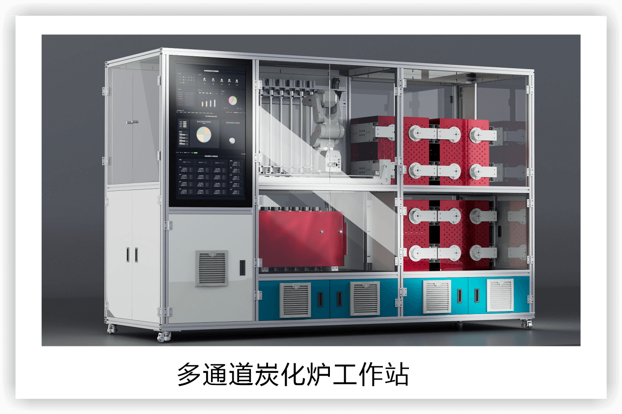 本实验室主要围绕炭材料制备和催化剂评价进行建设,现有设备包括:3套自动化炭化工作站、6套固定床反应器及其他配套的称量、表征设备。每套炭化工作站包含6管立式炉和32管卧式炉,各管路可独立精准控制气氛,如此高通量的炭化装置在国际上也属罕见;每套固定床反应器配备4个独立控温的加热炉,系统均为高低压兼容,最高压力可达5MPa,物料装填与转运全程实现无人化操作。